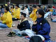 虽然天空中不时飘着小雨,对弟子们来说仿佛并不存在。大家集中注意力发正念、根除邪恶。