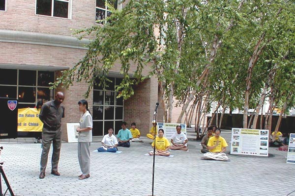 在新闻发布会上我们宣读了一份声明,两份来自政府的褒奖,一份李洪志日的褒奖,一份印第安那泊里斯市褒奖,还有一位大学生关于他的母亲在中国被关押的陈述。整个会议期间,学员们一直在打坐。