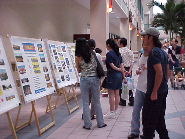 江泽民犯罪集团迫害法轮功及法轮功学员不断升级,法轮功学员被迫害致死的人数剧增,尤其是中国哈尔滨万家劳教所迫害十五名女法轮功学员致死的惨案,惨无人道;这些使休士顿大法弟子加快洪法的步伐。刚刚结束在休大明湖区洪法图片展一个月,今天,大法弟子分成多个小组,在休士顿中国各主要商场外同时举办洪法图文片展,大量的中英文图文片吸引了众多的中美人士观看,有些还仔细阅读全部图文,有些当场表示要学炼法轮功;大法弟子向他们发放有关揭露邪恶的资料,包括万家劳教所迫害十五名女法轮功学员致死的惨案的资料,向他们发放了"自焚"真相的录像带;尤其一些从中国来的人士更关注这些图文。大法弟子采用大量中英文图文片展的洪法方式快而广,让世人了解了法轮功,对法轮功有了正确的认识。清除了邪恶的毒害,坚定地维护大法及救度众生。
