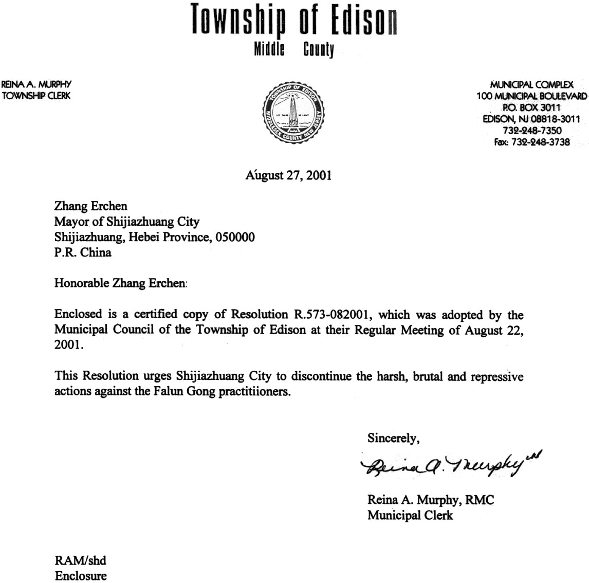信里是573-082001号决议的公文正副本,于在8月22日的爱迪生市议会上通过。