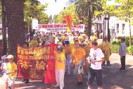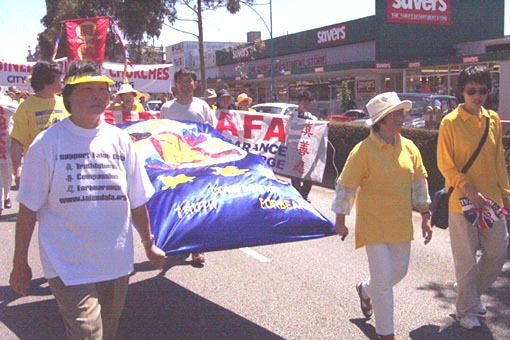 【明慧网2002年1月29日】一月二十六日,是澳大利亚的国庆节,维多利亚州的一些市区都要举办丰富多彩的活动,学员们很早就开始为这一期间的洪法做准备了。二十六日这一天,可算是今年入夏以来最热的一天,一大早学员们就赶往三个主要的活动地点(肯斯顿Kingston、丹尼龙dandenong和墨尔本市中心)布置展位,从早上10点钟开始,各个地方的活动陆陆续续开始,游行、功法表演、接受媒体采访,为了避免由于地点多人员分散,许多学员往返于不同的活动之间,使洪法达到了更好的效果。许多平时很少出来的学员也参加了这些活动,一些新学员也加入了我们的游行队伍。一些小弟子更是精神可嘉,这边刚参加完游行就又赶往别的地方去做功法展示,他们还处在在父母面前撒娇的年龄,可在洪法和正法中他们却毅然担当起了主角的责任,他们那出色的表现,总是给人们留下深刻的印象。