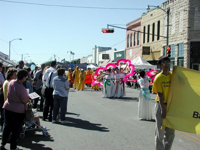 法轮功学员的游行队伍引人注目,金黄色的炼功服,印有“法轮大法好”的风车,还有队伍中精彩的舞蹈表演,博得了观众的阵阵掌声。观众们争先恐后地索要大法的材料,不时地有人说:“真美啊!”还有人说:“你们走过时,我们感到非常舒服,一片祥和。”