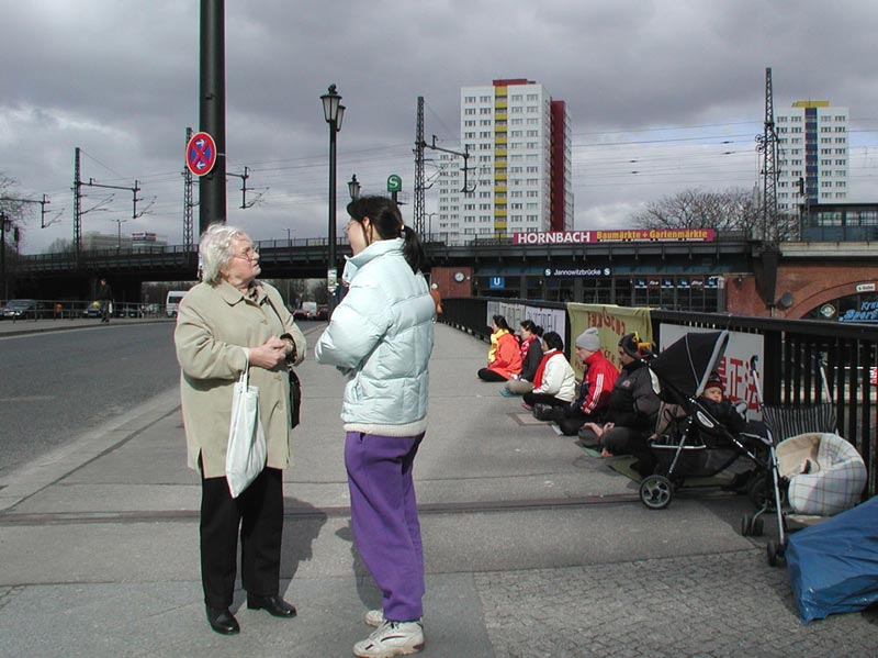 在附近大楼里工作的一位德国政府部门职员对我们说,他把从学员处借来的真相录像在他的朋友圈里传看。他又和我们聊了很久,提了不少问题,最后他真诚地祝愿我们成功。一个对法轮功的迫害几乎一无所知的德国女孩听了学员的介绍后觉得很难过。她主动要把学员介绍给她的教区的神父,并希望在后天星期日做礼拜时学员能去介绍法轮功在中国的迫害情况。