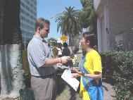 3月12日中午十二点开始,王洋和王晓丹在休士顿中领馆前正式开始绝食,同时在十二点至一点举行发布会,“自由谈”电台前往采访,在发布会上,电台采访人员录下了王洋和王晓丹的绝食声明及大法弟子代表的声明。王洋和王晓丹还向电台叙述了她们本人及家人的遭遇。路人也纷纷观看展板及询问有关被迫害的问题。