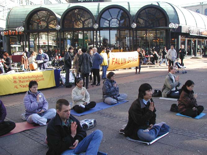 三月二日这天,从周边的不莱梅(Bremen)、汉堡(Hamburg)、卡塞尔(Kassel)和哥庭根(Goettingen)等城市陆续赶来的学员加上当地弟子共三十多人参加了这一活动。一位女学员带着两个幼儿也赶来了。学员们先集体发正念,并在每一轮炼功之前都发一次正念。天气出乎意外的好,晴空万里,初春的太阳照在身上暖洋洋的。汉诺威城里熙熙攘攘地挤满了周末来逛街的人群,当人们见到学员祥和的炼功场景,再看到SOS展板鲜明的对照,许多人被震惊了,大多数人对江泽民政府的迫害大陆学员一事表示不可理喻,不少人在要求释放熊伟的呼吁书上签名。不断地有人前来询问,打听炼功点和索要资料。也有不少人当场就跟学员学起功法来。