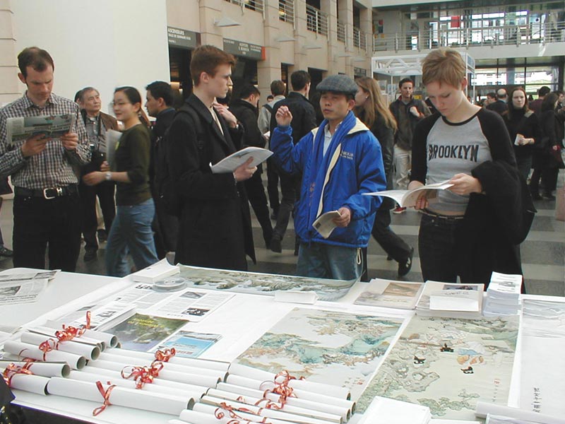 日内瓦大学共有5000多学生,在画展期间很多中国学生前来了解法轮功真相,之后改变了他们以前对法轮功的不正确观念。还有的说:“好极了,在这里举行中国画展,弘扬中国文化艺术,为中国人争光。”我们每天中午、下午两次在学生休息时,用扩音喇叭向学生和教师介绍法轮功及长春大法弟子通过有线电视台介绍法轮功真相后,江泽民犯罪集团穷凶极恶地下了“杀无赦”的命令。然后章翠英又讲述了在中国监狱的恐怖遭遇。