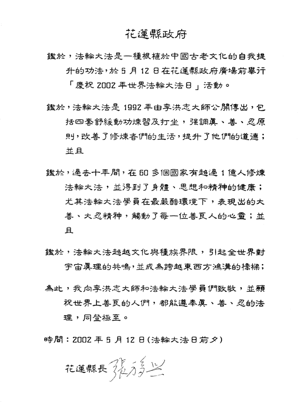 鉴于,法轮大法是一种根植于中国古老文化的自我提升的功法,于5月12日在花莲县政府广场前举行「庆祝2002年世界法轮大法日」活动。