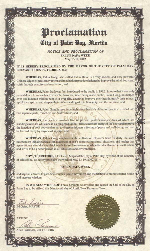 鉴此,我,艾德.盖尔(Ed Geier),棕榈湾(Palm Bay)市市长,特此宣布2002年5月13日至19日为