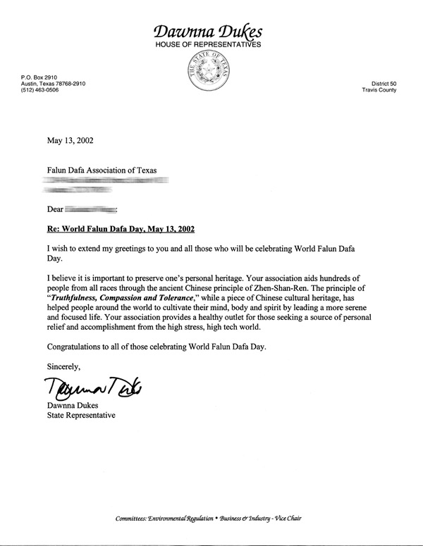 我相信保持个人的传统是重要的。你们大法学会用中国古老的真-善-忍准则,帮助了成千上百不同种族的人民。作为中国文化传统的一部份,“真、善、忍”准则帮助世界各地的人民享有更平静与专注的生活,从而修炼他们的身心和精神。你们的学会为那些在紧张而繁重的高科技世界中寻找个人慰藉与成就的人提供了一条健康之路。