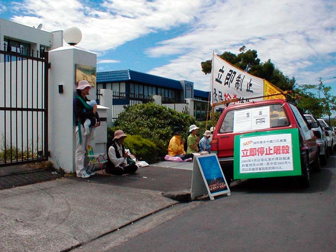 【明慧网2003年1月15日】新西兰大法弟子为期三天(1月12日──14日)的要求江氏集团停止“群体灭绝”暴行的活动进入第三天。在中国驻奥克兰总领馆外,大法弟子24小时炼功、打横幅、发正念。14日中午大法弟子在总领馆外召开了新闻发布会。
