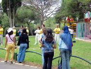 很多中国人在经过这里时看到竟然有这么多的白人也在炼法轮功,感到非常惊讶,我们发现他们在观看了展板上受迫害的图片和资料后再给他们讲真相就不是那么困难了,很多人都能认真的听下去并都能去冷静地思考了,有的说:“我早就在心里怀疑大陆宣传的对不对,如果炼法轮功真的会导致自杀、自焚,就不会有这么多的外国人炼了。”一位抱小孩的妇女主动走上前来索取真相资料,她说她很清楚在大陆没有真正的言论自由和信仰自由,她绝不会相信江泽民对法轮功的造谣宣传,并说她在国内的亲戚们很多都在炼法轮功。她对江××在西班牙被起诉表示支持。
