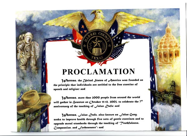 美国德州阿瑟港市市长宣布2003年10月12日为“李洪志日”暨2003年10月6日至12日为“法轮大法周”。