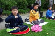 | 戴志珍女士在接受记者采访 | 小弟子端坐莲花之中 | 小法度与明慧学校的学生一起在“和平的花瓣”旗帜前炼功 |