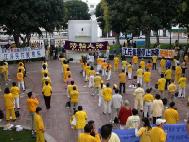 图片:参加美西法会的大法弟子举行新闻发布会呼吁营救李祥春并游行洪法