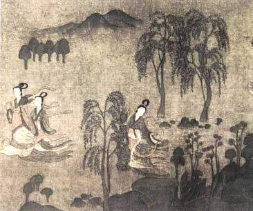紧随其后的六朝,一个蓬勃的绘画艺术朝代又出现了。“自生人以来未有也”的顾恺之,工诗赋,擅冉法,他笔下的《女史箴图》“气韵生动”,境界超然。一幅《洛神图》虽然描述了一段曹植与洛神之间的凄婉的爱情故事,却不也蕴涵着人、神之间有着一种默契与沟通吗?六朝的绘画技法的头一条“气韵生动”道出画家应以修身养性为主,才能使笔下的人物、山水、鸟兽,花草生机勃勃,意境深远。“画如其人”的说法大概就是从那个时候来的吧。我们再看这六朝的哪一个画家不是深受道、儒学说的熏陶,并对佛教景仰甚至崇信的呢?精湛的六朝丹青绘画艺术被其后的隋代画家所承传。阁楼宫观、人物肖像和神话故事的巧妙结合散发着宁静而安详的精神气息。展子虔的《游春图》画面蕴涵着愉乐,悠然的气息,远处的山景、花草、树木与近处的人物还有着互相衬托,互相默契的奇妙之处。