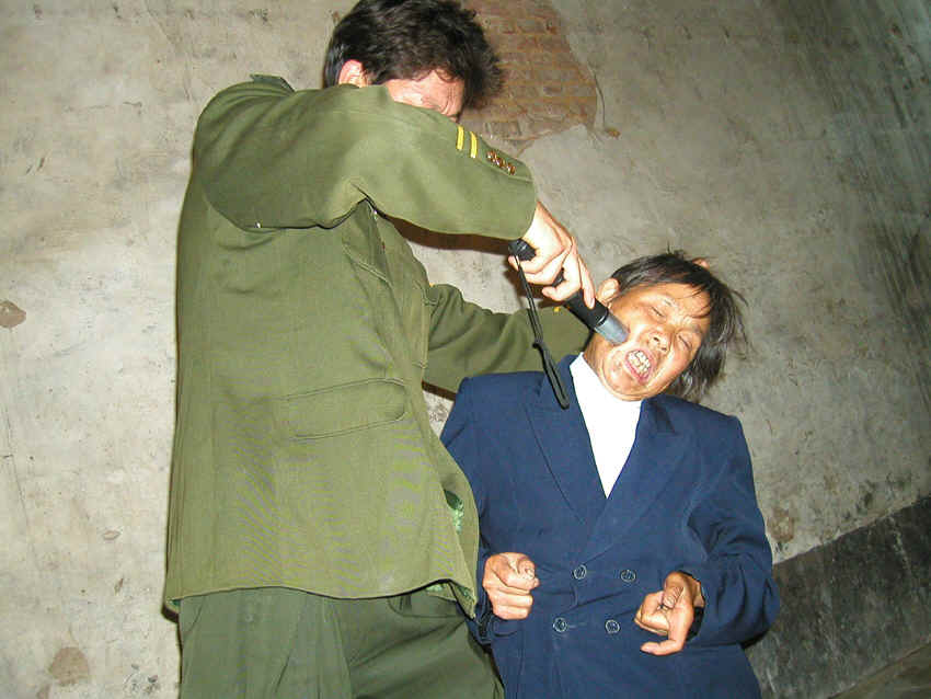 | 中国人民警察正在“执法”,老妇人跪着,警察用电棍电嘴。受刑的老妇人是家庭教会信徒苗爱珍,地点是河南省禹州市文殊乡派出所。施暴者是:禹州市公安局政保股警察孟山隆(男,40多岁)。 | |