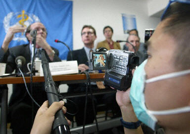 ![]() WHO在北京召开新闻会。现场负责电视音响效果的男士带着防护口罩。 |