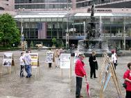 令人惊奇的是,中午时分,当学员冒雨驱车赶到广场时,雨渐渐变小;当展板安置好时,雨停了,风住了,游人出来了,天空也清透起来了。正法之路图片展顺利进行……三小时后,展览结束,当学员离开广场时,雨又象漏了天似的下了起来。