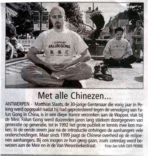 比利时安特卫普报5月12日报导,马地亚斯-斯拉茨,一位30岁的根特居民,曾于2002年因抗议中国政府对法轮功的镇压而在中国被捕。他在“德瓦培”一个靠近“德美尔”的地方静坐入定。法轮功已经秘传数千年,直到1992年才被介绍给公众。在传出的最初七年里,法轮功获得了很多褒奖。但是从1999年开始,中国政府开始镇压这一超过一亿人的人群。在我们的国家,修炼法轮功是自由的,这一点从这周六他们在“德美尔”和“德范维生贝克街”的活动得到了印证。