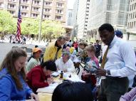 最近,我们到一个华人常去的街区展示法轮功功法并阐述在美国对江泽民诉讼案的真相。许多人想更多的了解功法并对江集团对和平的法轮功修炼者的镇压表示愤慨。许多年轻人学炼功动作,还表示了修炼功法的愿望。相当多的人在起诉江的签名表上签名,其中许多人来自中国大陆。还有一些年轻的大陆中国人表达了他们对在中国违反人权的状况的愤慨。