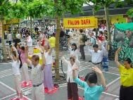 学员们于5月31日在法兰克福的最热闹的商业区展示功法。很多行人被这个安静的气氛深深吸引,站住了脚步。另一些人听学员讲解法轮功学员在中国遭受迫害的情况。还有一些在以前就亲身受过集权的政府的专制,或者见证了人权侵犯和集权政府头目的对权力的占有欲,很清楚这种迫害的残酷。一位年轻的女士来了好几次,并且马上学了功。