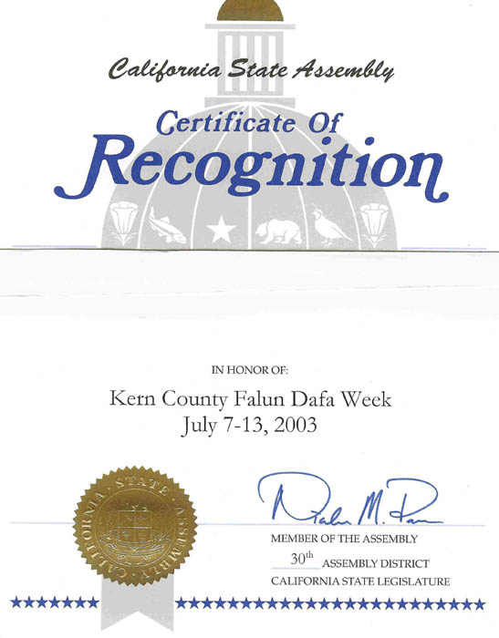 • 加州第16选区参议员签署“克恩县法轮大法周”决议