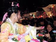 穿上唐代衣服向市民送花