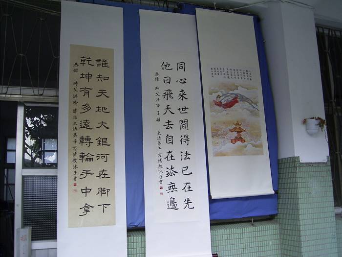 | 大法小弟子的静功演示 | 全体中部明慧师生大合唱:《明慧学校校歌》 | 字画艺术的展示 |