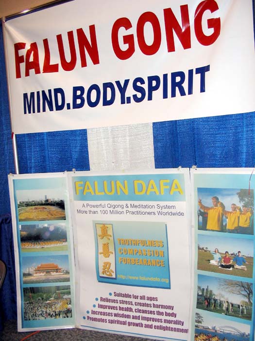 ![]() 博览会上介绍法轮功的展台 | ![]() 功法演示 |