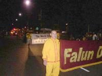游行快要开始时,我们点灯照亮法轮图,可保险丝马上就烧掉了。换了保险丝后,灯不久又灭了。司机和学员们一起开始发正念,不久灯就恢复了照明。我们的游行队伍很长,领头是两面横幅,然后依次是法轮图、腰鼓队,三面法轮横幅和花车。沿途还有学员散发介绍功法和讲述迫害的传单。