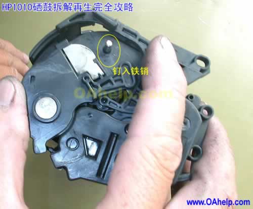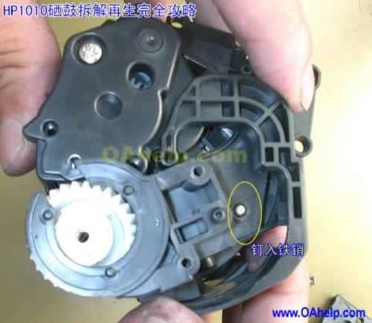 2)打孔:将需加粉的墨盒准备好,将电烙铁通电加热,在墨盒仓外靠边缘处烙开约5mm的圆孔(可以注入粉即可),如图2白圆圈处在右边或右边开一个孔均可以。开孔时烙铁头不要伸的太深,只要将粉仓外皮烫开即可,尽量将熔化的塑胶挑出去,防止污染粉仓内部,影响打印效果。