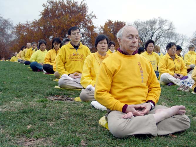 【明慧网2004年11月24日】2004年11月23日美国感恩节前夕,纽约曼哈顿中央公园东面,在一棵棵红绿黄桔色充满秋意的枫树之间,千名法轮功学员排出了两个醒目的大字“正法”,配上“法轮大法好”、“世界需要真善忍”的大横幅成为纽约东街的一个奇特的景观。悠扬的炼功音乐和祥和的炼功场面,令很多过往的行人以及马路对面的大楼里工作的很多职员或驻足或隔窗观看。很多路人赞叹法轮功真的好。