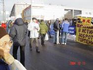 【明慧网2004年12月13日】2004年12月10日是世界人权日。11日莫斯科法轮功学员顶着严寒,在莫斯科国民经济展览馆对面的和平大街沿街设立展板、标语牌和模拟在中国发生的江氏集团对法轮功学员的酷刑折磨。标语牌用俄-中两国文字写着:“真、善、忍”;“法轮大法好”;“法办江泽民、罗干、周永康、刘京”;“立即停止在中国迫害法轮功学员”。