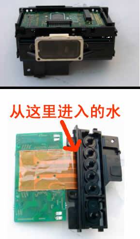 【故障分析】:为什么会出现喷头有水?明明把水擦干了的,这水从何来?——爱普生喷头,电路板是紧贴喷头后面,你以为把上面水擦干了,这个电路板的背面还沾有水!