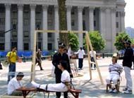 广场上真实模拟了恶警用酷刑“坐铁椅子”、“惩罚性灌食”、“坐铁笼”、“长时间吊打”折磨大法弟子的场面。