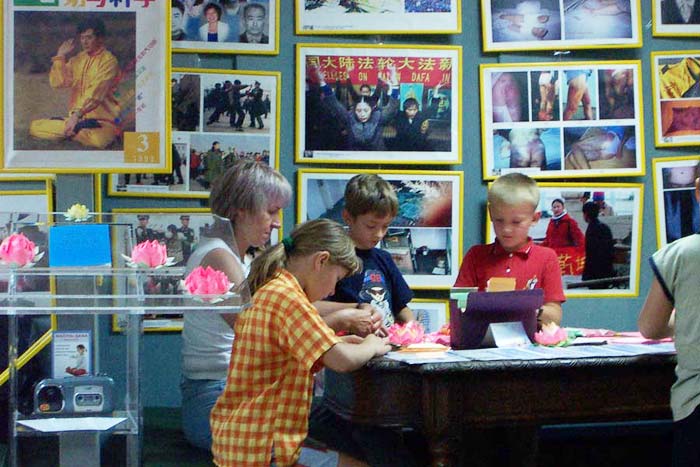 在图片展大厅内,学员们除了表演功法、介绍法轮功功法和“真善忍”法理之外,还教孩子们做莲花折纸,很多孩子都到这里来学做纸莲花。很有趣的是,有个小男孩,是当地有名的“坏孩子”,他也在和大家做莲花,在画展结束时,他共做了8朵莲花,并且一直非常的安静,仿佛这些代表修炼人“出淤泥而不染”高尚品质的圣洁的莲花唤醒了他内心深处的善良与纯真。