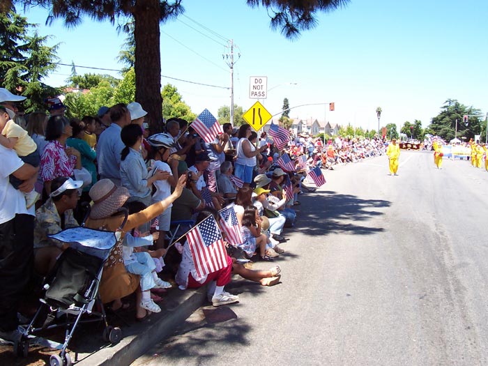 法轮功的队伍首先是由中、西方学员打出的“法轮大法”和“真善忍”横幅。雄壮、喜庆的腰鼓队紧随其后,鼓声震邪。“法轮大法好”的歌声、绚丽多彩的服装和优美的舞姿,不断获得市民们的掌声。有的人对法轮功的队伍竖起了大拇指。有的人说,太好了、太美了。