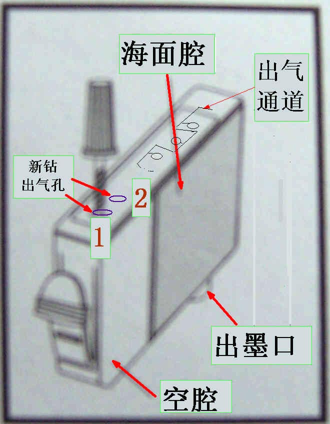 根据这个原理,我在实践中,发现只要在墨盒空腔上多钻一个出气孔就可以解决排气排墨问题,因为加墨时,墨盒内多余的空气会从新钻出气孔2及时排出;“离机”加墨,要封闭出墨口,如果墨盒在打印机上,其出墨口与打印机紧密相连,就等效是封了出墨口,所以,可以“连机”加墨。