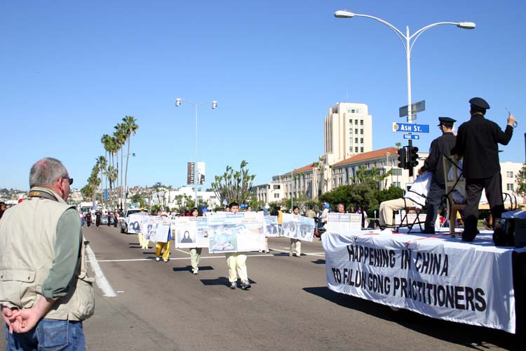【明慧网2005年1月18日】一年一度的圣地亚哥“马丁•路德•金日”游行于1月15日在圣地亚哥市中心举行。马丁•路德•金(Martin Luther King, Jr., 1929--1968)是美国著名黑人领袖,民权运动的一面旗帜。为了纪念这位人权斗士,每年一月的第三个星期一被定为“马丁•路德•金日”。因为历史的关系,美国各地的马丁•路德•金日庆祝活动都备受社会瞩目。为了利用好这次机会深入讲清真象、救度更多众生,圣地亚哥大法弟子以“反酷刑展”的方式参加了这次游行。一位看到酷刑展的黑人男士说,这些学员遭到的迫害比黑人历史上遭到的迫害严重无数倍。