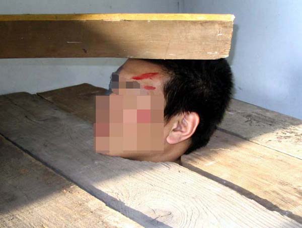 吉林监狱把坚定的大法学员塞进床下,坐在水泥地上,掀开床用床板狠狠的夹住脖子,上面只露出头部根本一点不能动,逼迫大法学员妥协。如坚持修炼,刑事犯人用手、拳、床板可任意毒打大法学员的头部,被打的大法学员因脖子被卡住、全身不能动,只能等着挨打。有的被打掉牙,有的被打得鼻青脸肿,再不写决裂书就送小号或严管加重迫害。