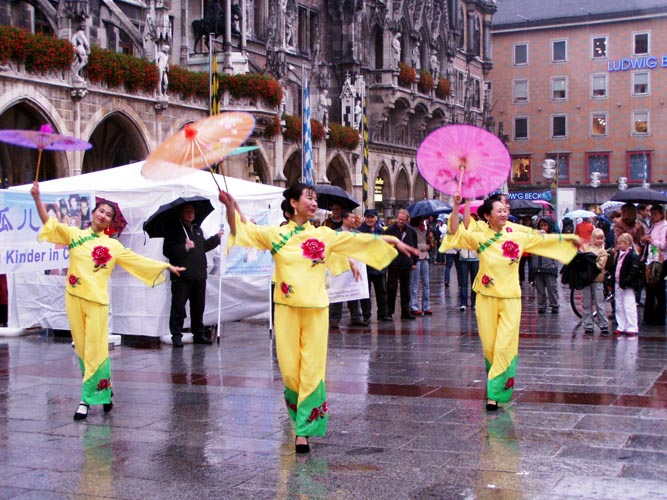时逢慕尼黑啤酒节,玛琳广场挤满了来自世界各地的游客。尽管整个下午慕尼黑被阴雨侵扰,演出依然照常進行,人们兴致高涨,丝毫不受天气影响,精彩的表演赢得了热心观众的阵阵掌声,他们也渴望了解那些在中国遭受迫害的法轮功青少年儿童的情况。
