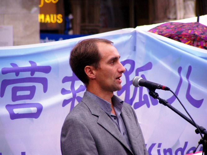 这场残酷镇压已经持续了六年多,但血腥的迫害从未停止过,由于中共封锁新闻,使人们无法得知这场迫害的真实情况。为了让德国民众了解真象,引起社会各界的反响,帮助那些孩子们,尽早结束在中国发生的人间悲剧,德国法轮功学员举办了这场露天的义演,很多观众通过义演了解到在中国大陆发生的对法轮功迫害,他们签名支持法轮功学员,有的观众对学员说,表演太美好了,有的希望迫害早日结束,还有的观众将雨伞送给站在雨中的法轮功学员。