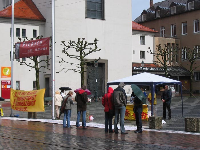 络绎不绝的行人纷纷接过学员递来的资料,有的边走边看,有的在车站等车时认真阅读。也有很多人冒雨停留在展板前,认真观看,有的还用手抹去展板上的雨水,再仔细的看。人们都被这些发生在中国的残酷事实所震惊。当学员问到是否知道法轮功时,不少人都说知道,在其它地方也看过真象资料,有的马上签名支持法轮功,有的给学员们鼓励,希望能够成功制止迫害。