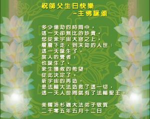 • 辽宁营口大法弟子向师父问好,敬祝师尊生日快乐!祝贺大法洪传十三周年!