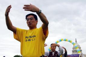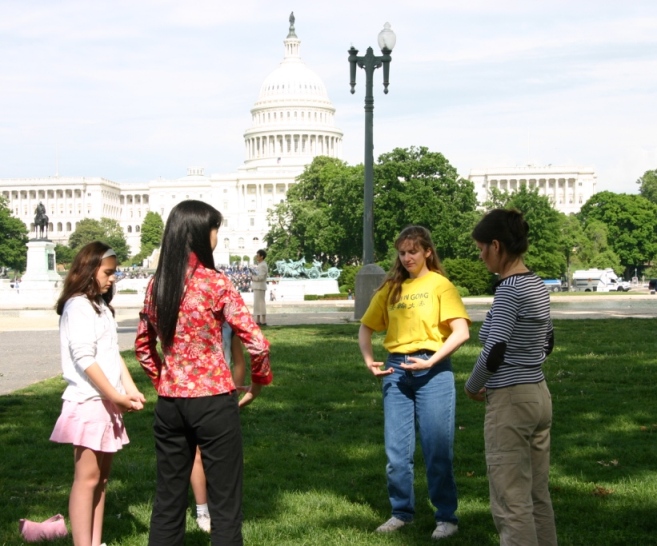 【明慧网2005年5月16日】五月十五日,农历四月初八,时值法轮大法洪传十三周年之际,也是我们师尊五十四寿辰。上百名华盛顿DC的法轮大法学员来到国会山前庆祝世界法轮大法日,敬贺慈悲伟大的师尊生日快乐。
