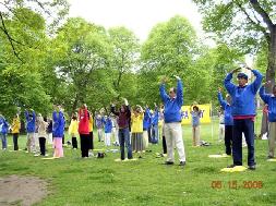 【明慧网2005年5月18日】(明慧记者悦然波士顿报道)2005年5月15日,来自美国麻州、新罕不什尔州和罗德岛的法轮功学员聚集在波士顿市中心的波士顿花园庆祝世界法轮大法日。庆祝活动以大型集体炼功为主,穿插舞蹈、木偶剧等表演。路边林立的讲述在中国发生的