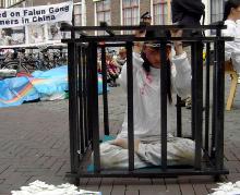 左边是穿着金黄色衣服、舒缓的炼着功法的学员;右边是被关在笼子里、被绑在老虎凳上或被吊起来的酷刑受害者,她们身后站着挥舞着警棍的“恶警”。旁边是文字和图片说明。因为地点是在市中心,过往的人群川流不息。不少人驻足观看,被祥和的功法感动,为残酷的迫害震惊。