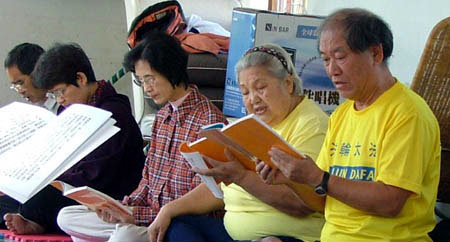和大家一起学法相互促进,是刘映谷(右一)生活中最愉快的时刻