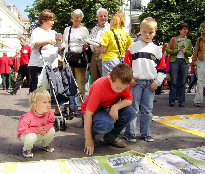 【明慧网2005年8月16日】2005年8月13日,法轮功学员在荷兰中部城市德芬特(Deventer)市中心举办洪法活动和揭露中共酷刑迫害法轮功学员的图片展。这天是周六,路过图片展的人特别多。祥和的功法表演和与残忍的酷刑图片形成了鲜明的对照,吸引了众多当地人的注意。