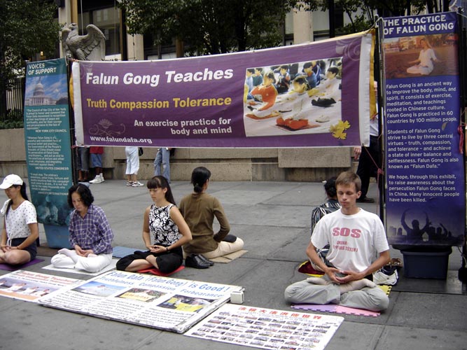 来自南台湾屏东的三位家庭主妇学员,子女已长大,获得家人的支持,长期在曼哈顿讲真象,她们参与每天曼哈顿街上的反酷刑展,以揭露中共对大陆同修的残酷迫害手段,她们有时扮演被迫害同修、有时派发传单、有时展示功法,有时去中领馆前发正念,无论晴天和雨天一天没落下。虽然她们只学会一点英文,但是来签名支持的人很多,有人还抱着学员激动的又哭又亲的,有人要捐钱帮助,但是都没收,只希望他们能把真象告诉更多人,电视和报纸的记者都来采访、拍特写镜头。